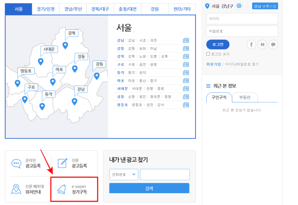 메인화면 우상단에 신문지역판 누르기