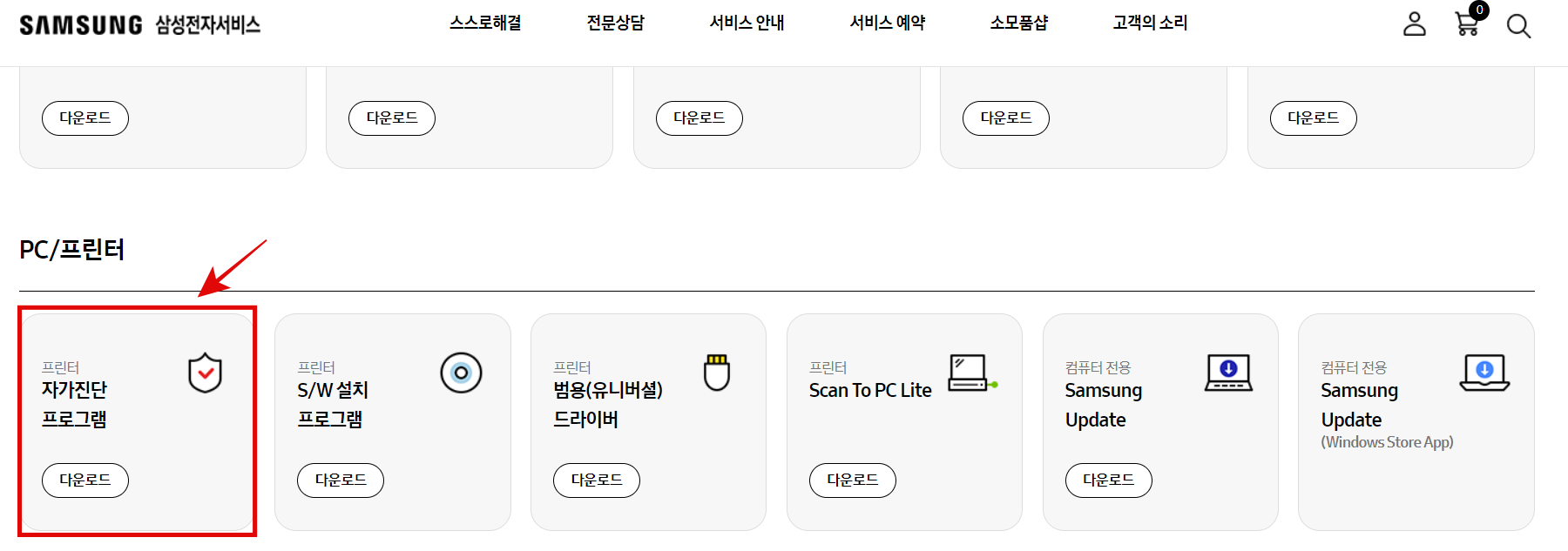 이동한 페이지 중앙에 있는 자가진단 프로그램을 다운로드하고 설치하여 프린터에 이상이 있는 지 우선 확인을 합니다.