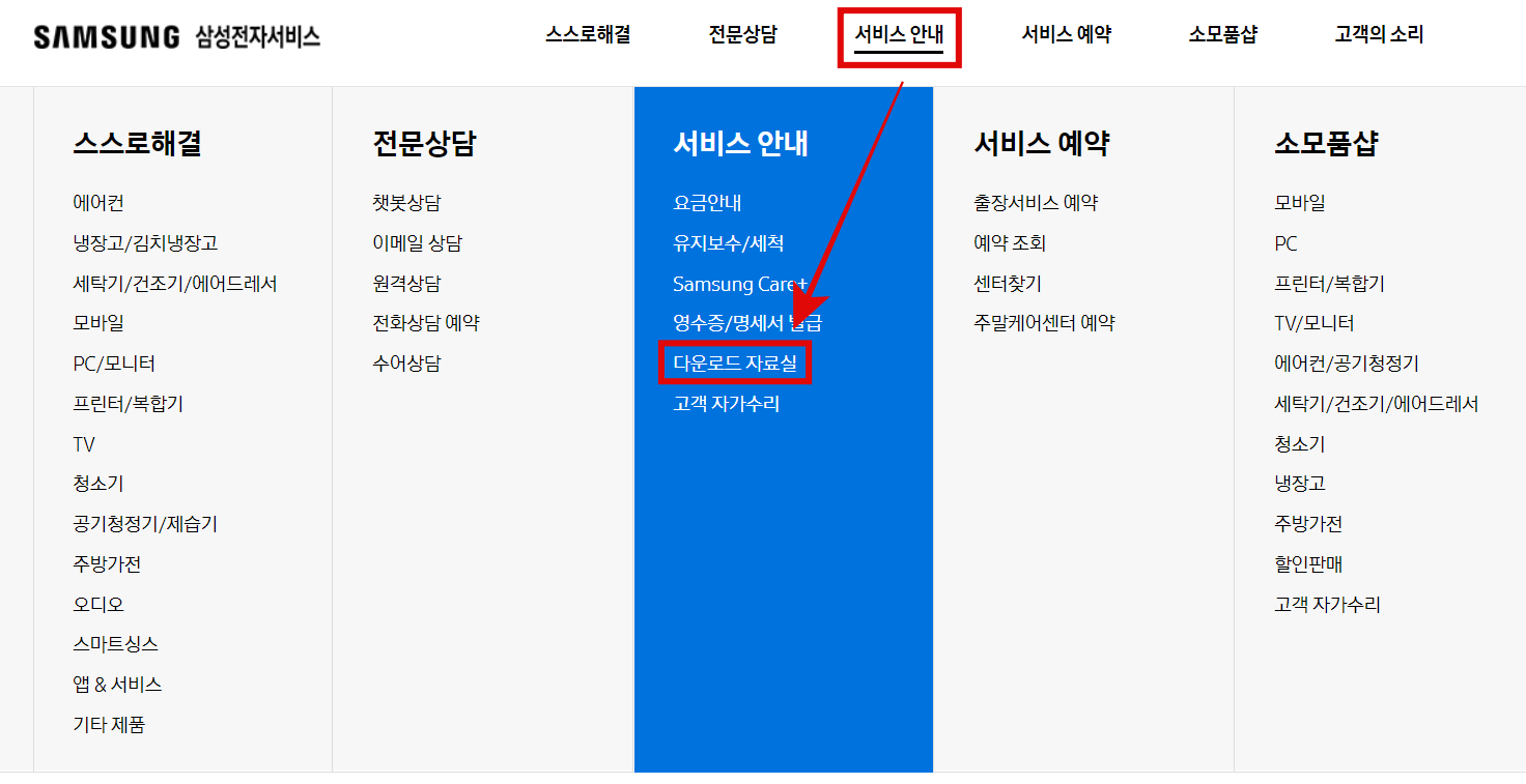 홈화면 상단에 있는 '서비스 안내'를 클릭하고 '다운로드 자료실'을 눌러줍니다.