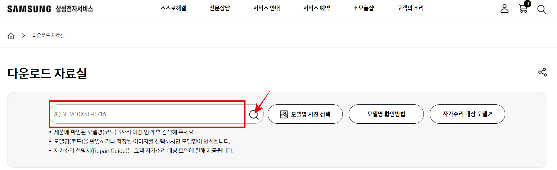 본인이 이용하는 삼성프린터 모델을 입력하고 돋보기 버튼을 눌러줍니다.