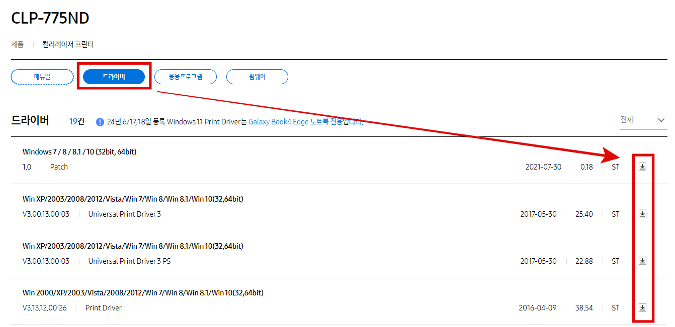 본인 프린터에 맞는 모델을 찾은 후 필요한 드라이버를 다운로드해줍니다.