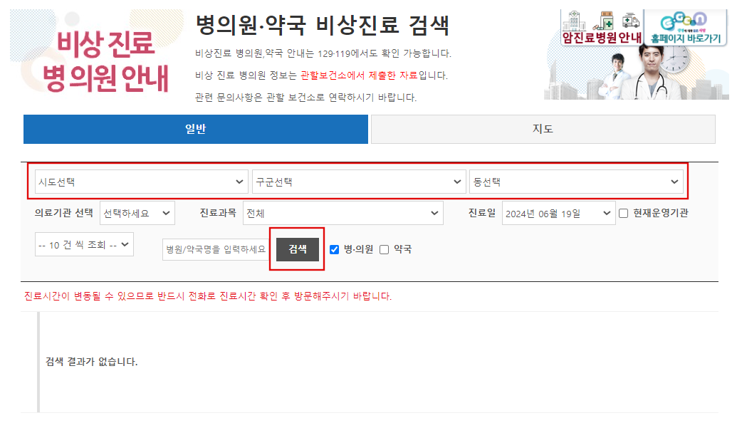 - 본인이 거주중인 시도 및 시군구 선택 후 검색 누르기