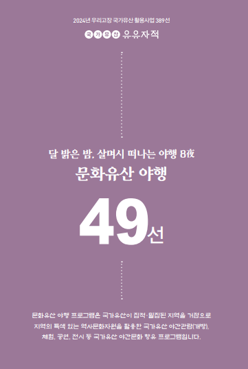 전국 49군데에서 펼쳐지는 문화유산야행에 대한 프로그램은 아래 책자를 통해 모두 살펴볼 수 있으며, 특히 날짜와 행사 취지에 대해 살펴보실 수 있으니 필요하신 분들은 다운받아 활용하시기 바랍니다.